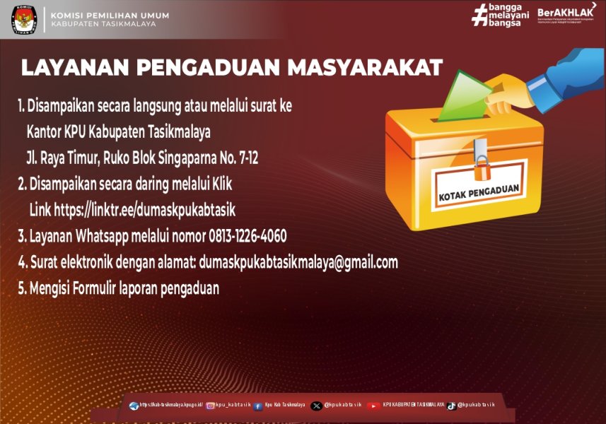 Untuk mewujudkan tata kelola pemerintahan yang baik serta meningkatkan kepercayaan masyarakat terhadap layanan publik, KPU Kabupaten Tasikmalaya perlu melakukan penataan sistem pelayanan. Salah satu langkah strategisnya adalah menyediakan fasilitas yang memungkinkan masyarakat untuk menyampaikan laporan secara langsung terkait dugaan pelanggaran oleh pejabat publik dalam pelaksanaan tugas dan fungsinya di lingkungan KPU Kabupaten Tasikmalaya.