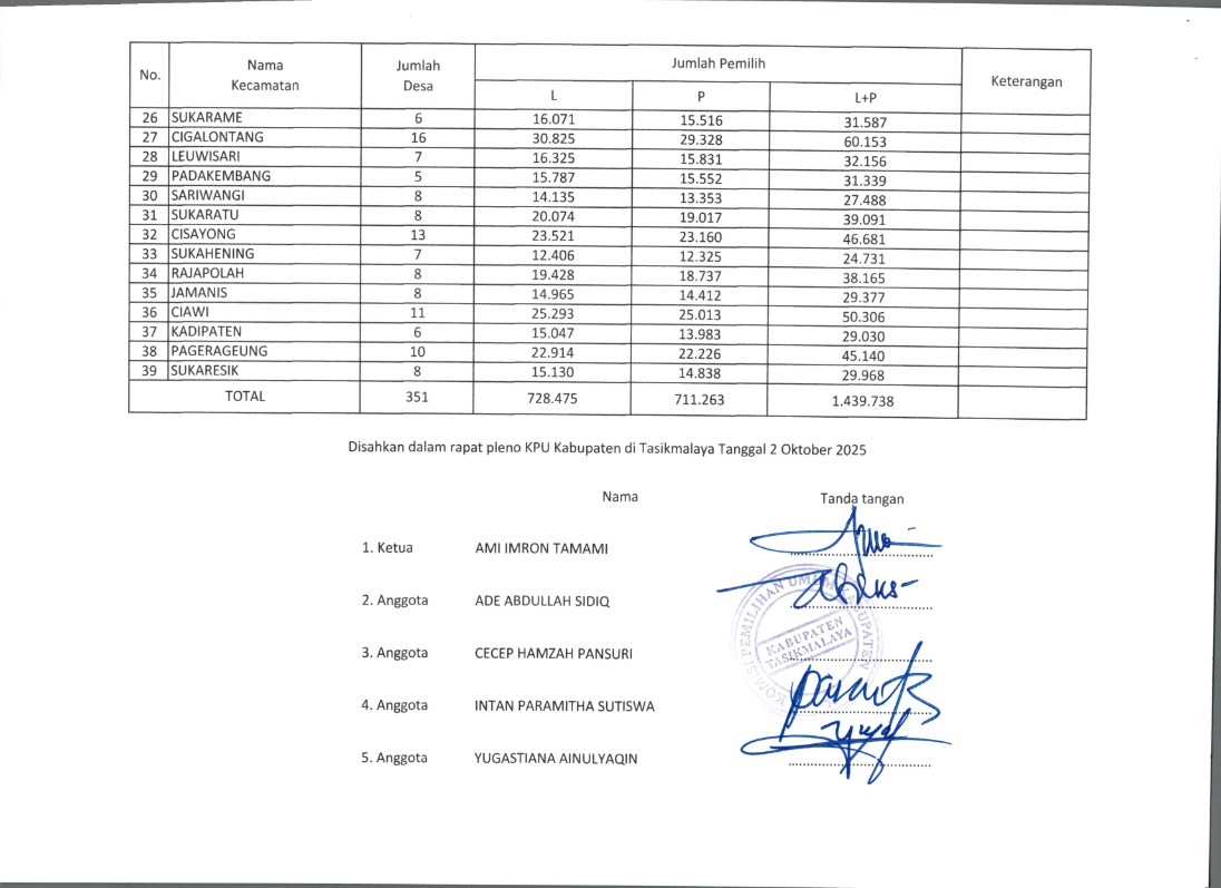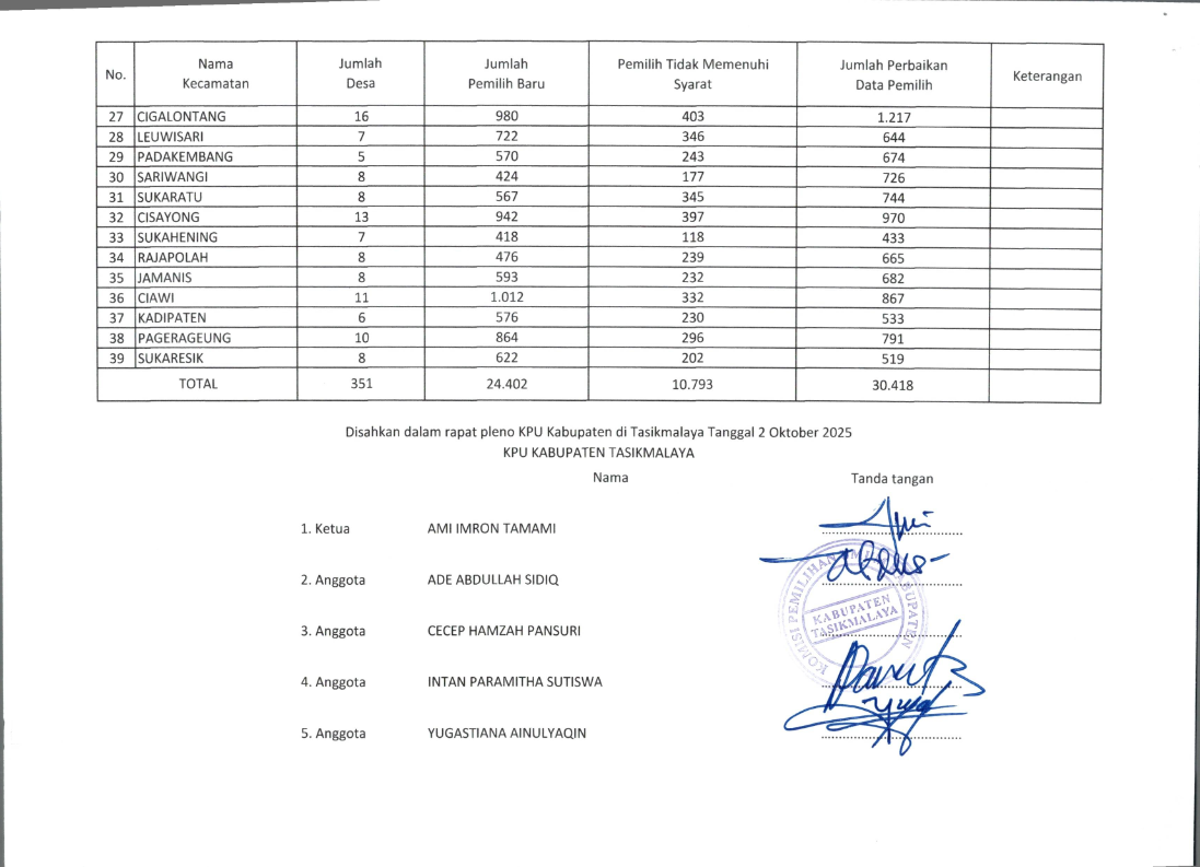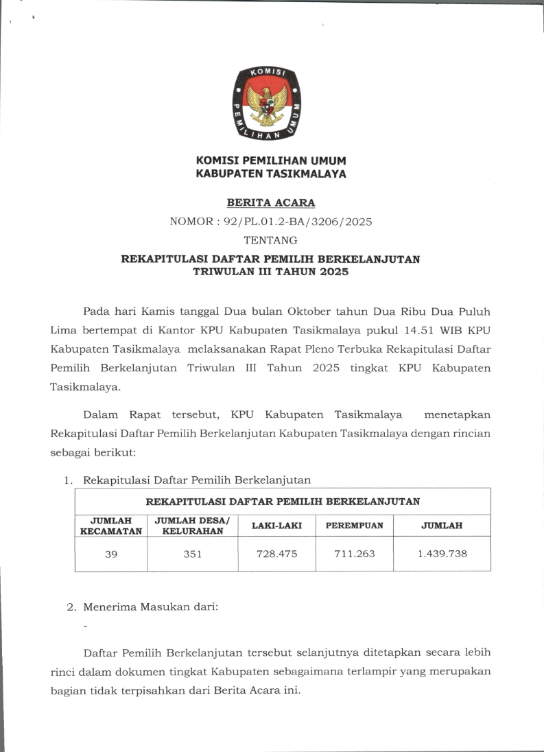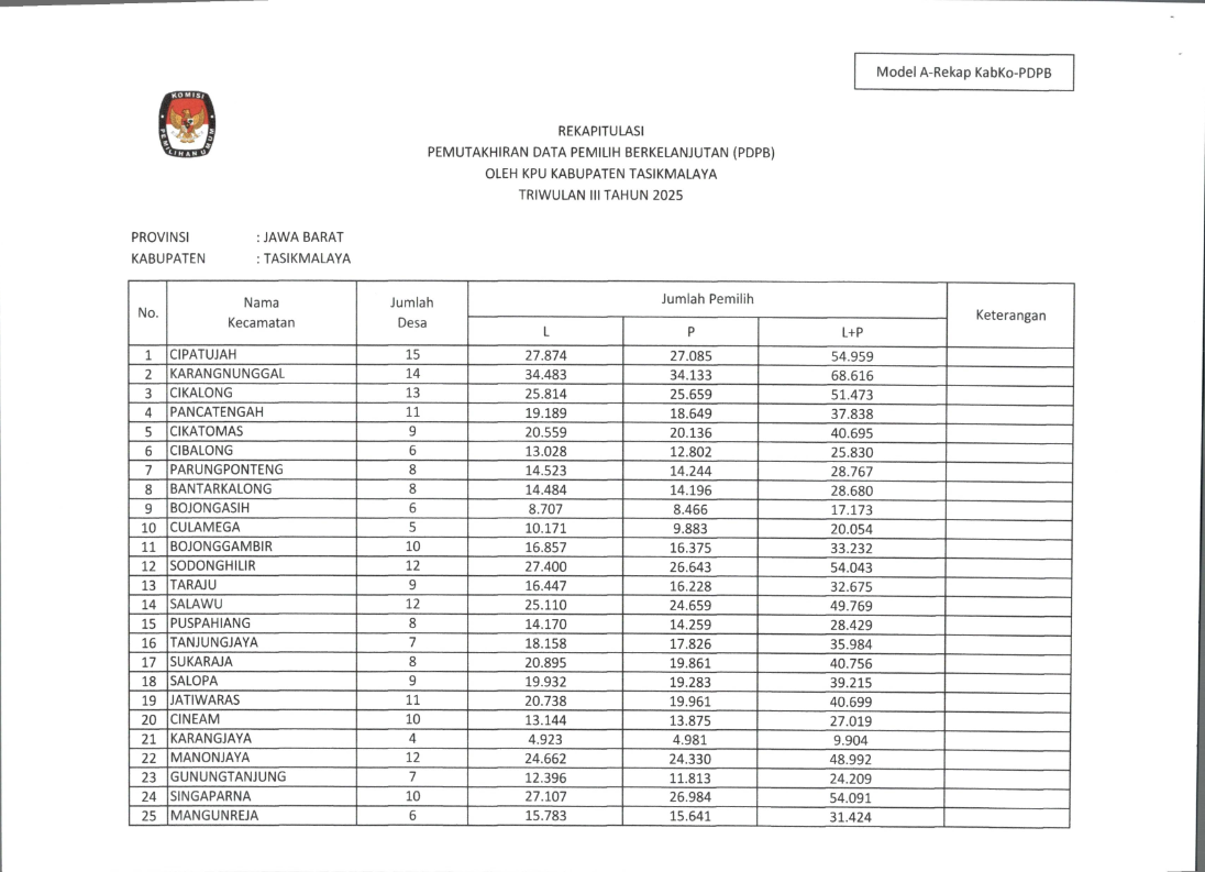 REKAPITULASI PEMUTAKHIRAN DATA PEMILIH BERKELANJUTAN TRIWULAN III TAHUN 2025 Kamis, 02 Oktober 2025 21:53 13 Bagikan: Dilihat 13 Kali.