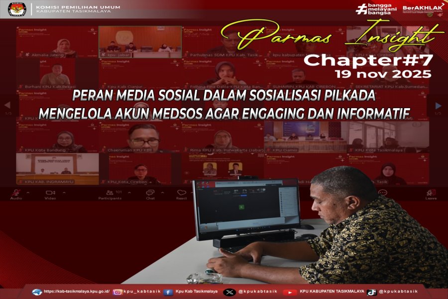 Tasikmalaya - KPU Kabupaten Tasikmalaya dalam hal ini Ketua Divisi Sosdiklih, Parmas dan SDM, Cecep Hamzah Pansuri, Kepala Sub Bagian Partisipasi, Hubungan Masyarakat dan SDM, Rani Megasari, beserta Staf Sub Bagian Partisipasi, Hubungan Masyarakat dan SDM, Cepi Cahaya, kembali mengikuti secara daring kegiatan Parmas Insight Chapter #7 dengan tema “PERAN MEDIA SOSIAL DALAM SOSIALISASI PILKADA: MENGELOLA AKUN MEDSOS AGAR ENGAGING DAN INFORMATIF”, yang diselenggarakan oleh KPU Provinsi Jawa Barat, pada Rabu (19 November 2025).