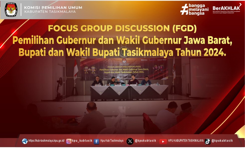 Komisi Pemilihan Umum (KPU) Kabupaten Tasikmalaya menggelar acara Focus Group Discussion (FGD) Penyelenggaraan Pemilihan Gubernur dan Wakil Gubernur Jawa Barat, Bupati dan Wakil Bupati Tasikmalaya Tahun 2024 dengan tujuan sebagai evaluasi penyelenggaraan Pilakda Serentak 2024 kemarin. Acara yang berlangsung di Gedung Majelis Ulama Indonesia (MUI) Kabupaten Tasikmalaya pada Rabu, 19 Februari 2025 itu dihadiri oleh berbagai unsur, mulai dari pemerintah daerah, unsur muspida (musyawarah pimpinan daerah), DPRD, TNI/Polri, Satpol PP, media, Badan Pengawas Pemilu (Bawaslu), akademisi, hingga tim pasangan calon.