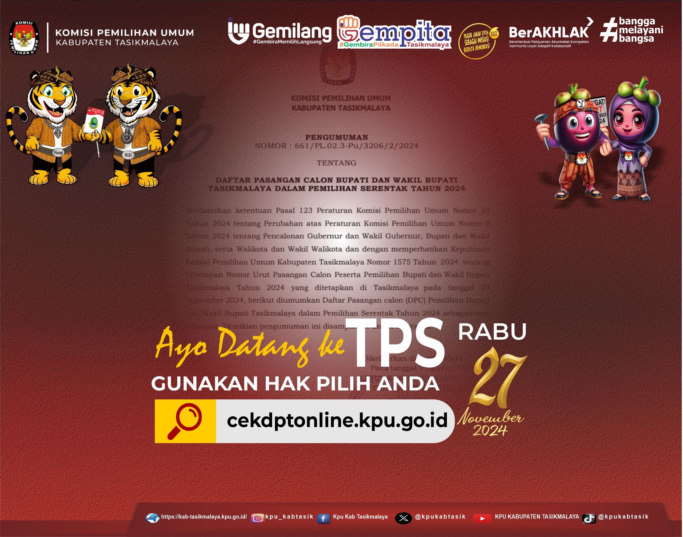 Berdasarkan ketentuan Pasal 123 Peraturan Komisi Pemilihan Umum Nomor 10 Tahun 2024 tentang Perubahan atas Peraturan Komisi Pemilihan Umum Nomor 8 Tahun 2024 tentang Pencalonan Gubernur dan Wakil Gubernur, Bupati dan Wakil Bupati, serta Walikota dan Wakil Walikota dan dengan memperhatikan Keputusan Komisi Pemilihan Umum Kabupaten Tasikmalaya Nomor 1575 Tahun 2024 tentang Penetapan Nomor Urut Pasangan Calon Peserta Pemilihan Bupati dan Wakil Bupati Tasikmalaya Tahun 2024 yang ditetapkan di Tasikmalaya pada tanggal 23 September 2024, berikut diumumkan Daftar Pasangan calon (DPC) Pemilihan Bupati dan Wakil Bupati Tasikmalaya dalam Pemilihan Serentak Tahun 2024 sebagaimana terlampir.