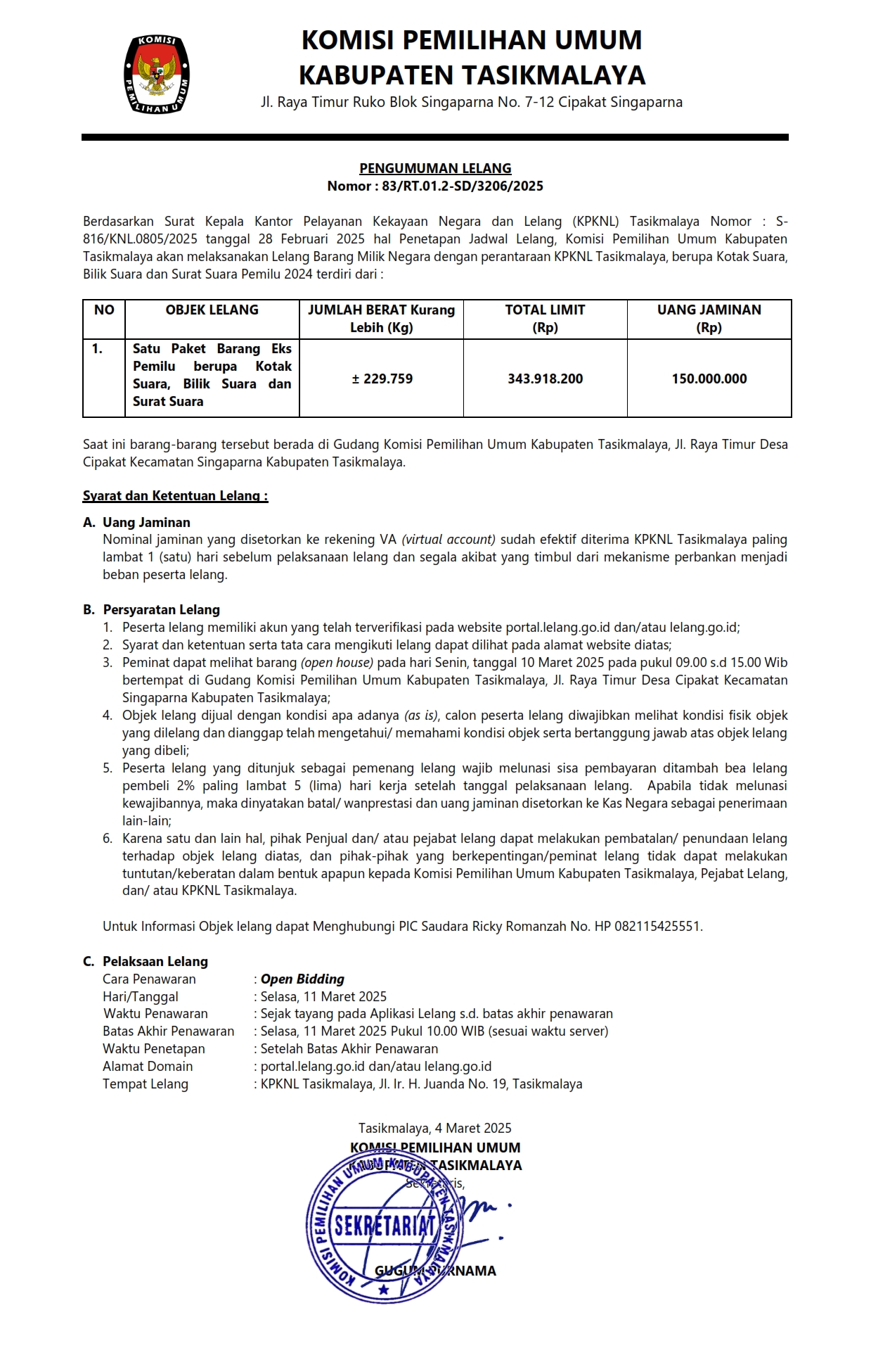 PENGUMUMAN LELANG NOMOR 83/RT.01.2-SD/3206/2025