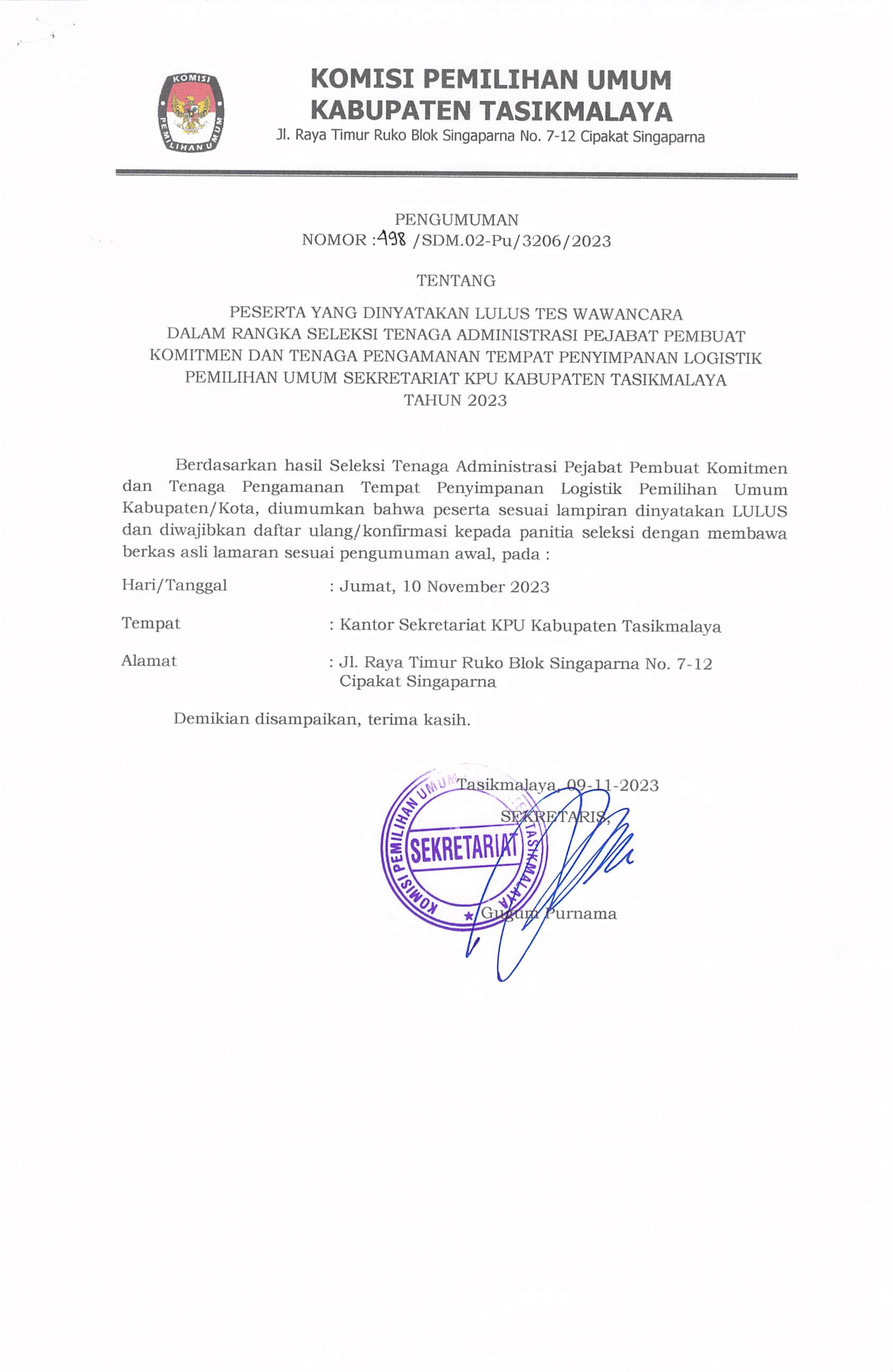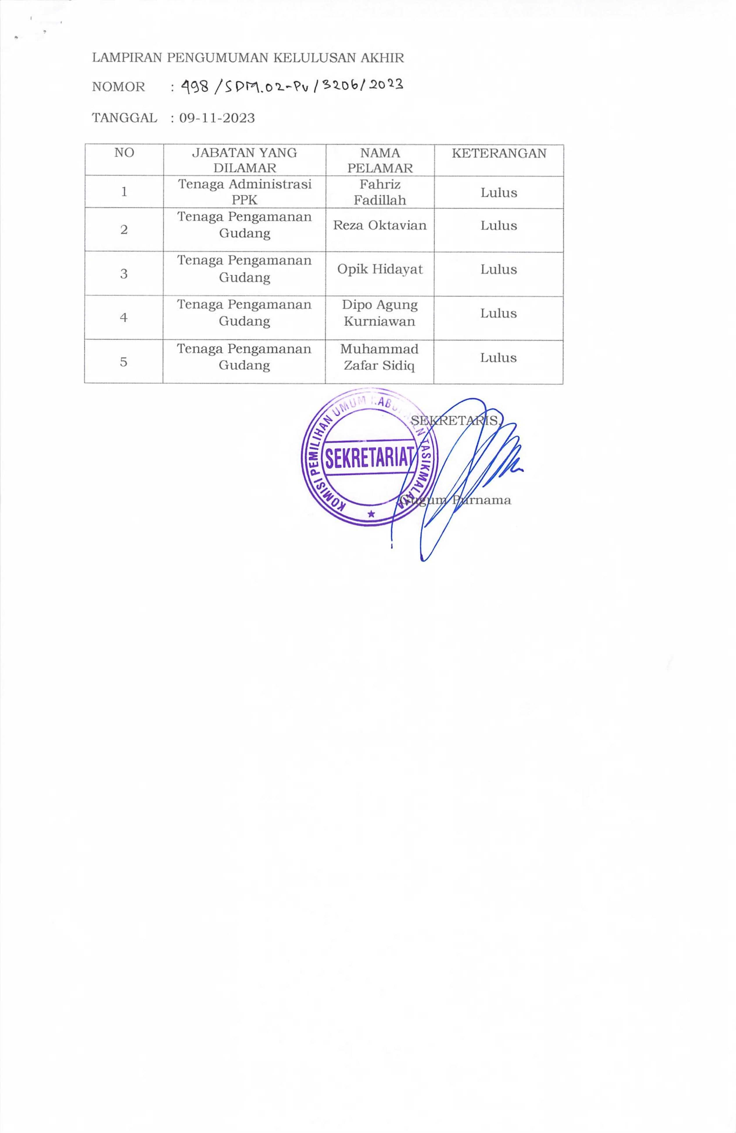 PENGUMUMAN NO. 498/SDM.02-Pu/3206/2023 Tentang Peserta yang dinyatakan lulus tes wawancara seleksi Tenaga Administrasi dan Tenaga Pengamanan Logistik