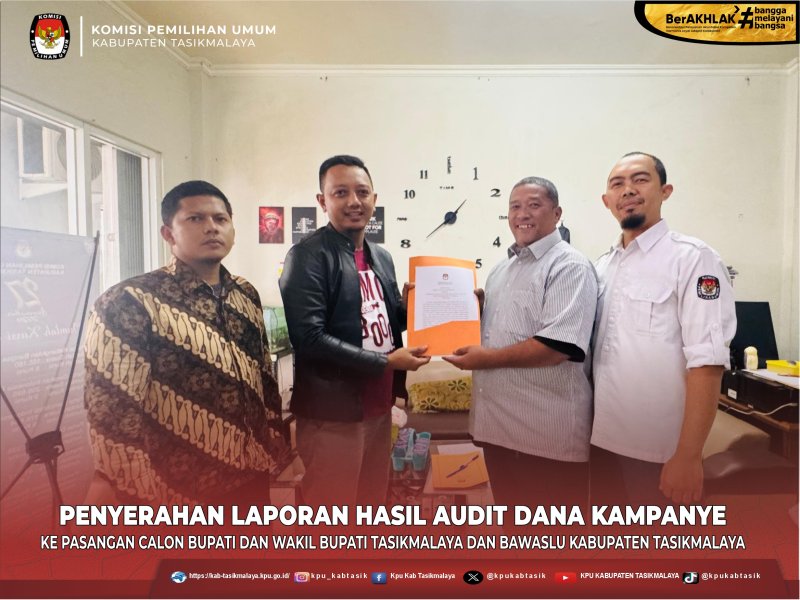 KPU Kabupaten Tasikmalaya mengumumkan Hasil Audit Laporan Dana Kampanye Pemilihan Bupati dan Wakil Bupati Tasikmlaya Tahun 2024. Pada hari yang sama diserahkan pula Hasil Audit Dana Kampanye Pemilihan Bupati dan Wakil Bupati Tasikmalaya kepada pasangan calon dan Bawaslu Kabupaten Tasikmalaya. Penyerahan Hasil Audit Laporan Dana Kampanye Pemilihan Bupati dan Wakil Bupati Tasikmlaya Tahun 2024 diterima oleh LO dari Pasangan Calon Bupati dan Wakil Bupati Tasikmlaya Tahun 2024. Kegiatan berlangsung pada tanggal 12 Desember 2024 bertempat di Kantor KPU Kabupaten Tasikmalaya.