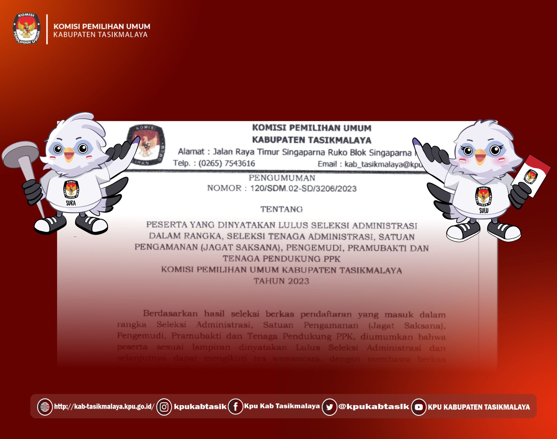 PENGUMUMAN NOMOR : 120/SDM.02-SD/3206/2023 Minggu, 26 Februari 2023 17:00 1325 PENGUMUMAN NOMOR : 120/SDM.02-SD/3206/2023 TENTANG PESERTA YANG DINYATAKAN LULUS SELEKSI ADMINISTRASI DALAM RANGKA, SELEKSI ADMINISTRASI TENAGA ADMINISTRASI, SATUAN PENGAMANAN (JAGAT SAKSANA), PENGEMUDI, PRAMU BAKTI DAN TENAGA PENDUKUNG PPK Bagikan: Dilihat 1,325 Kali.