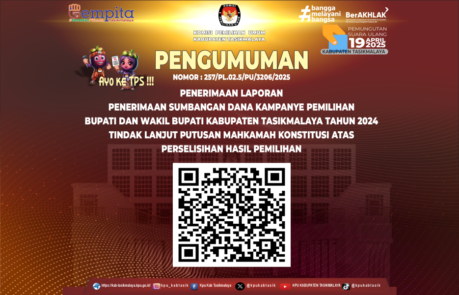 PENGUMUMAN NOMOR : 257/PL.02.5/PU/3206/2025 Senin, 14 April 2025 05:10 1115 PENGUMUMAN NOMOR : 257/PL.02.5/PU/3206/2025 PENERIMAAN LAPORAN PENERIMAAN SUMBANGAN DANA KAMPANYE PEMILIHAN BUPATI DAN WAKIL BUPATI KABUPATEN TASIKMALAYA TAHUN 2024 TINDAK LANJUT PUTUSAN MAHKAMAH KONSTITUSI ATAS PERSELISIHAN HASIL PEMILIHAN Bagikan: Dilihat 1,115 Kali.