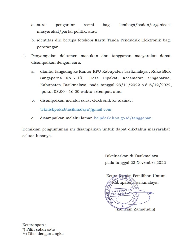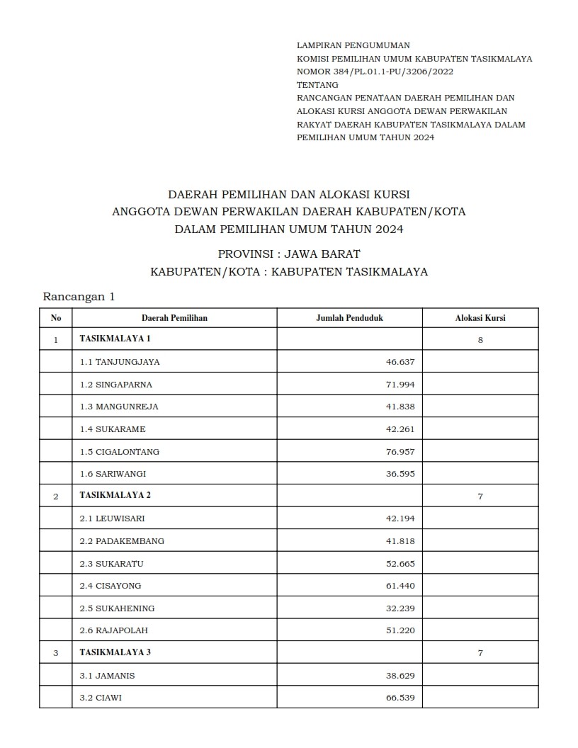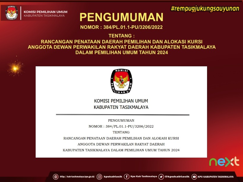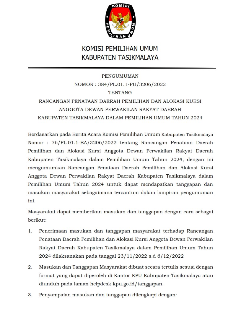 PENGUMUMAN NOMOR : 384/PL.01.1-PU/3206/2022 TENTANG RANCANGAN PENATAAN DAPIL DAN ALOKASI KURSI Kamis, 24 November 2022 07:00 1370 Bagikan: Dilihat 1,370 Kali.