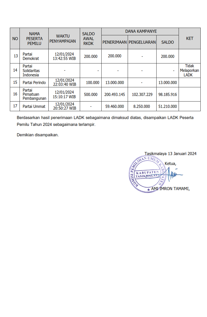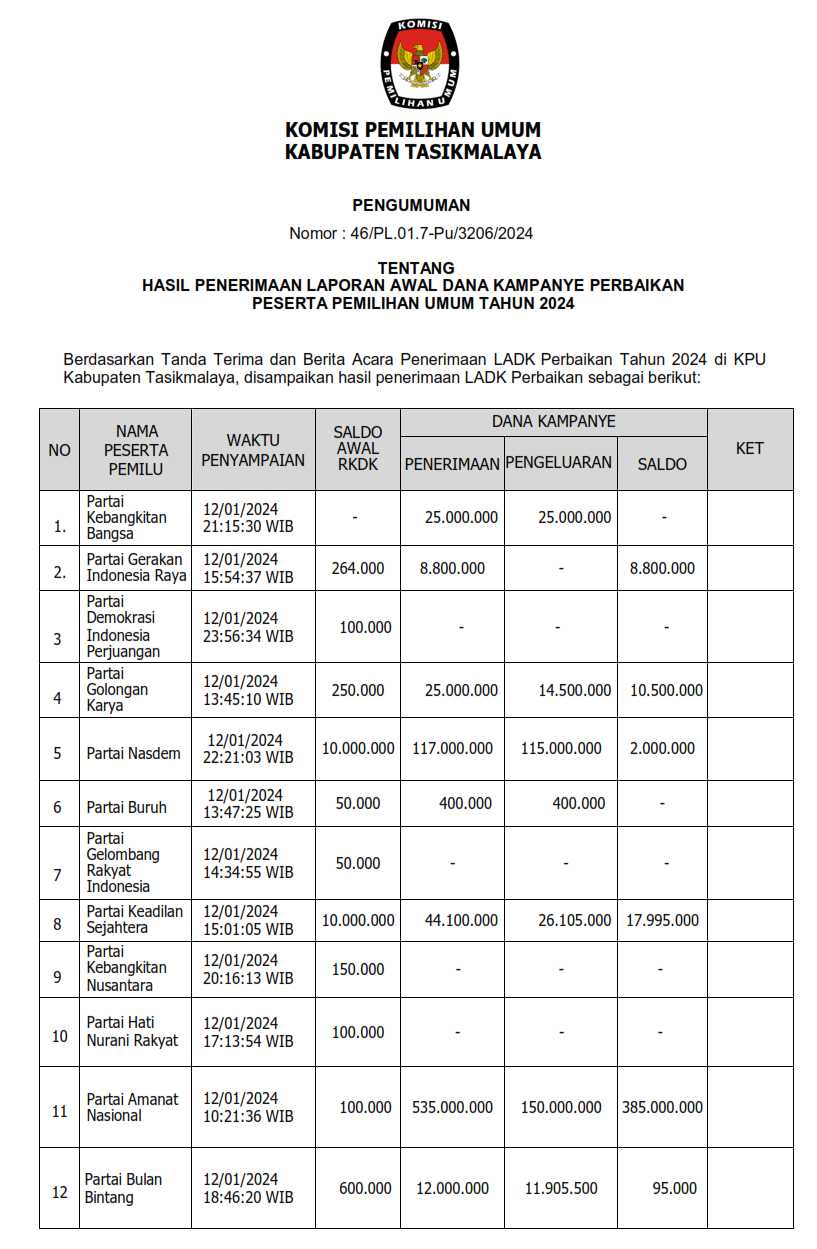 PENGUMUMAN Nomor : 46/PL.01.7-Pu/3206/2024 TENTANG HASIL PENERIMAAN LAPORAN AWAL DANA KAMPANYE PERBAIKAN PESERTA PEMILIHAN UMUM TAHUN 2024 Senin, 15 Januari 2024 22:00 697 Bagikan: Dilihat 697 Kali.