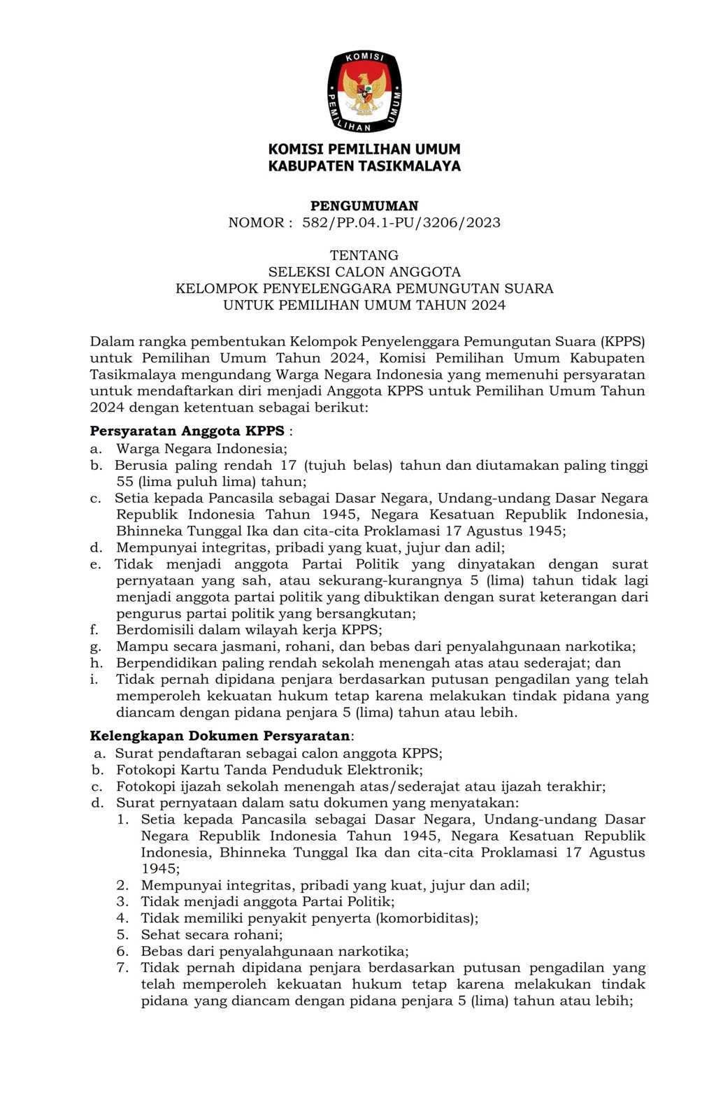 PENGUMUMAN NOMOR : 582/PP.04.1-PU/3206/2023 Tentang Seleksi Calon Anggota KPPS Untuk Pemilihan Umum Tahun 2024 Senin, 11 Desember 2023 00:11 974 Bagikan: Dilihat 974 Kali.