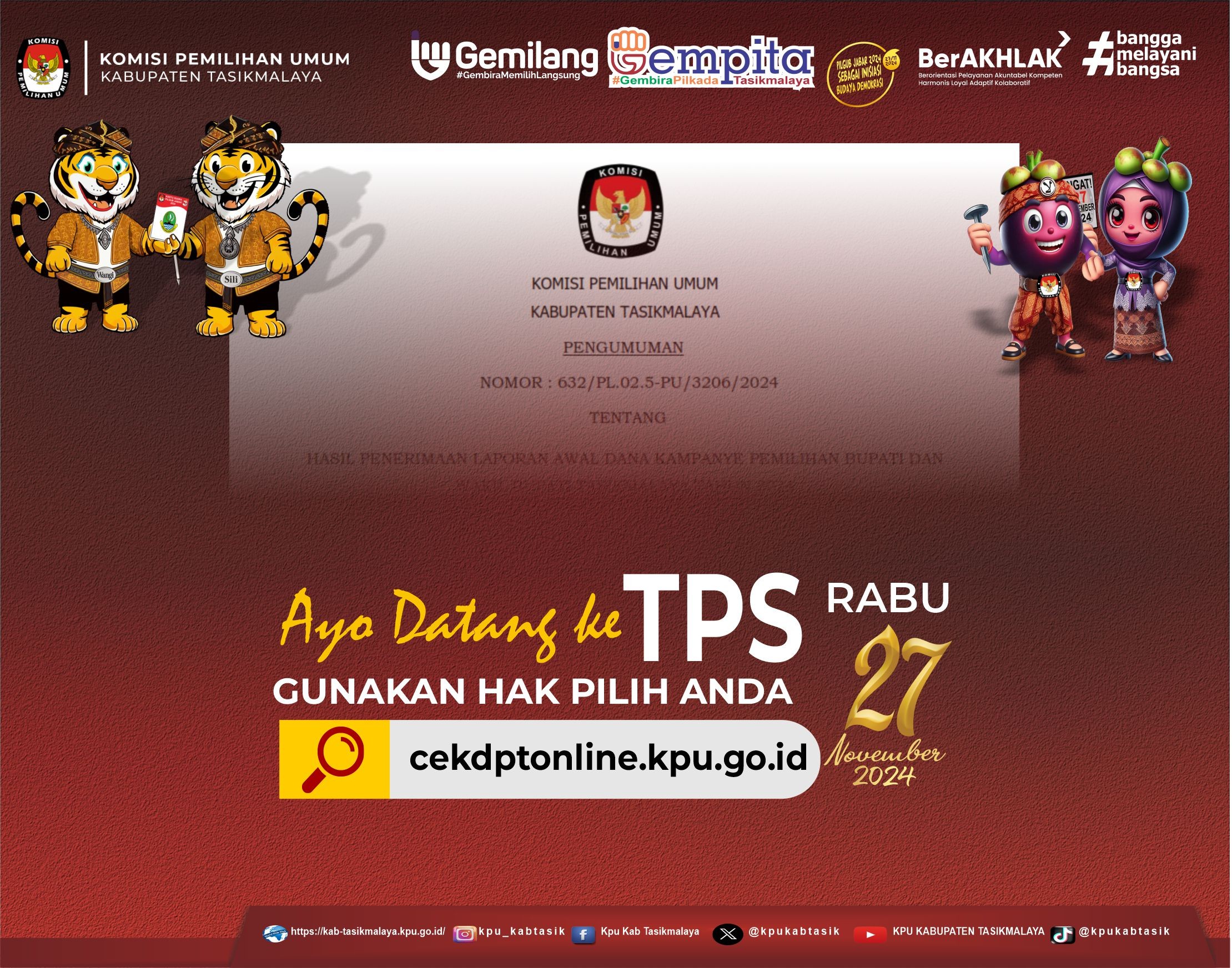 PENGUMUMAN NOMOR : 632/PL.02.5-PU/3206/2024 TENTANG HASIL PENERIMAAN LAPORAN AWAL DANA KAMPANYE PEMILIHAN BUPATI DAN WAKIL BUPATI TASIKMALAYA TAHUN 2024 Sabtu, 28 September 2024 15:15 702 PENGUMUMAN NOMOR : 632/PL.02.5-PU/3206/2024 TENTANG HASIL PENERIMAAN LAPORAN AWAL DANA KAMPANYE PEMILIHAN BUPATI DAN WAKIL BUPATI TASIKMALAYA TAHUN 2024 Bagikan: Dilihat 702 Kali.