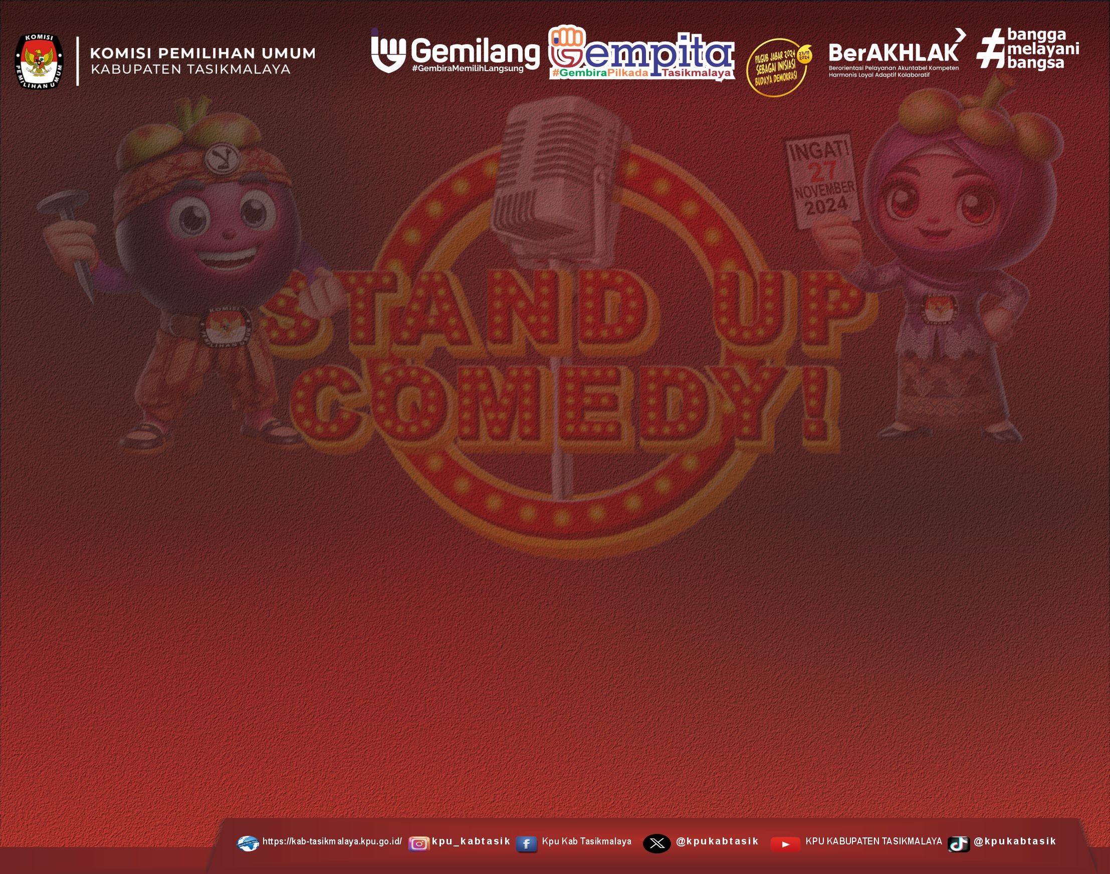 PENGUMUMAN NOMOR : 827/PP.06.2-Pu/3206/2024 TENTANG GRAND FINAL LOMBA STAND UP COMEDY Jumat, 08 November 2024 07:00 742 PENGUMUMAN NOMOR : 827/PP.06.2-Pu/3206/2024 TENTANG GRAND FINAL LOMBA STAND UP COMEDY UNTUK PEMILIHAN GUBERNUR DAN WAKIL GUBERNUR JAWA BARAT, BUPATI DAN WAKIL BUPATI TASIKMALAYA TAHUN 2024 Bagikan: Dilihat 742 Kali.