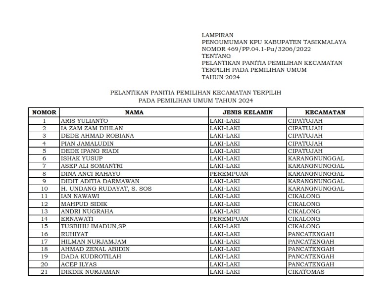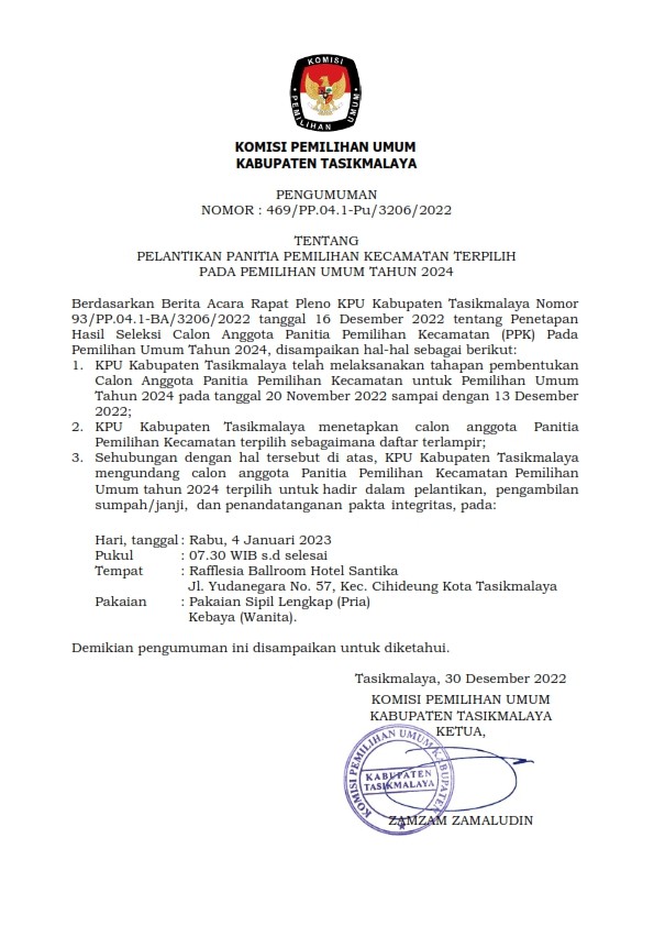 PENGUMUMAN PELANTIKAN PANITIA PEMILIHAN KECAMATAN TERPILIH PEMILU TAHUN 2024 Sabtu, 31 Desember 2022 10:10 1344 Bagikan: Dilihat 1,344 Kali.