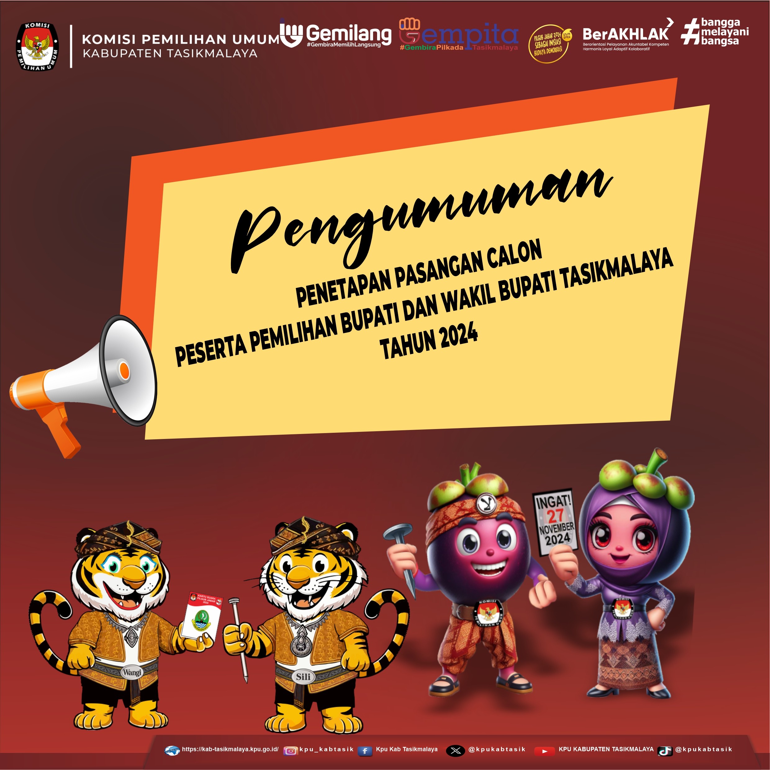 PENGUMUMAN TENTANG PENETAPAN PASANGAN CALON PESERTA PEMILIHAN BUPATI DAN WAKIL BUPATI TASIKMALAYA TAHUN 2024 Minggu, 22 September 2024 10:00 762 Keputusan Komisi Pemilihan Umum Kabupaten Tasikmalaya tentang Penetapan Pasangan Calon Peserta Pemilihan Bupati dan Wakil Bupati Tasikmalaya Tahun 2024, menetapkan nama Pasangan Calon yang Lampiran Keputusan yang dapat diunduh pada tautan berikut Bagikan: Dilihat 762 Kali.