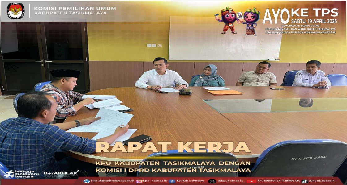 Pada tanggal 27 Maret 2025 KPU Kabupaten Tasikmalaya melakukan Rapat Kerja dengan Komisi I DPRD Kabupaten Tasikmalaya. Pelaksanaan Rapat Kerja berlangsung di Ruang Rapat Kerja Komisi I DPRD Kabupaten Tasikmalaya. Rombongan peserta Rapat Kerja dari KPU Kabupaten Tasikmalaya terdiri dari Komisioner KPU yaitu Ketua KPU Ami Imron Tamami, Anggota KPU Divisi Hukum dan Pengawasan Ade Abdullah Siddiq dan Anggota KPU Divisi Perencanaan Data dan Informasi Intan Paramitha Sutiswa serta didampingi oleh Sekretariat KPU Kabupaten Tasikmalaya Kasubbag Perencanaan Data dan Informasi Agung Adhisetiono. Materi Rapat Kerja terkait Persiapan KPU Kabupaten Tasikmalaya untuk pelaksanaan Pemungutan Suara Ulang.