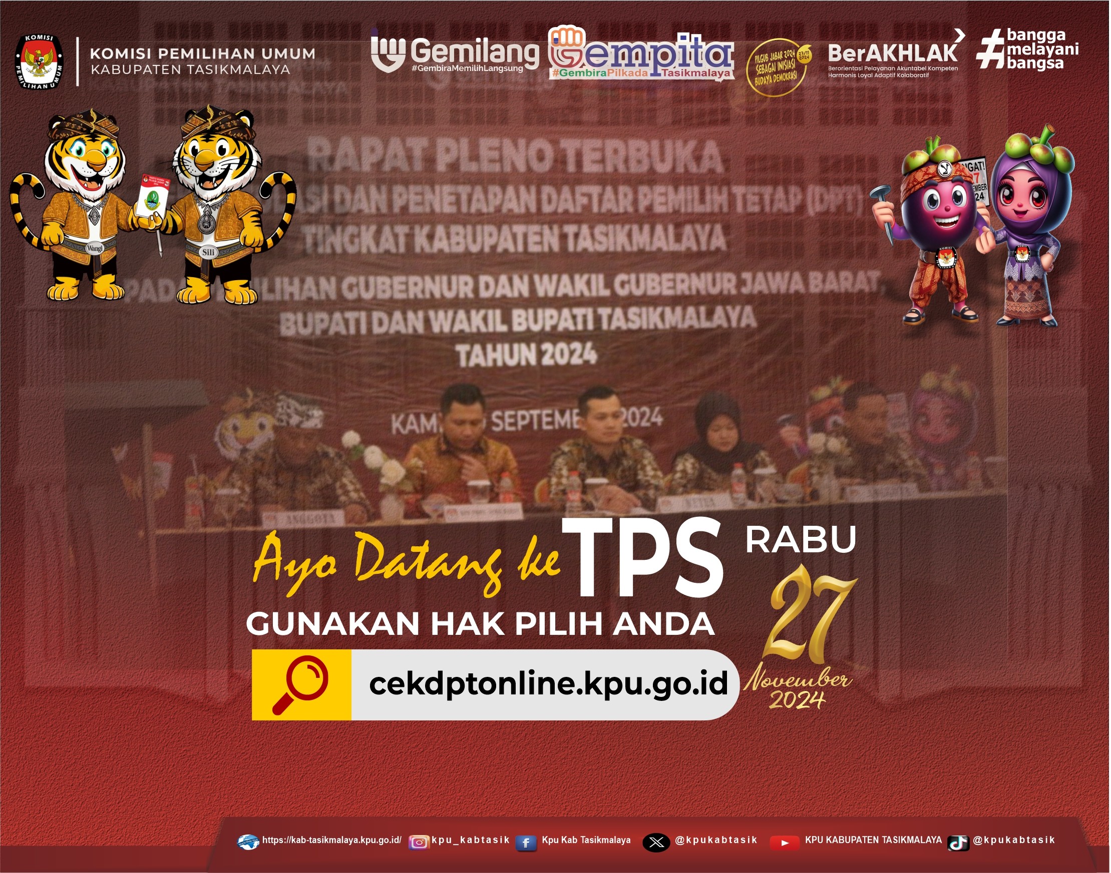 Pada hari kamis, 19 September 2024 KPU Kabupaten Tasikmalaya melaksanakan Rapat Pleno Terbuka Rekapitulasi dan Penetapan Daftar Pemilih Tetap (DPT) Tingkat Kabupaten Tasikmalaya pada Pemilihan Gubernur dan Wakil Gubernur Jawa Barat, Bupati dan Wakil Bupati Tasikmalaya Tahun 2024 bertempat di Alhambra Hotel & Convention Singaparna - Kabupaten Tasikmalaya. Peserta rapat terdiri dari Ketua dan Divisi Rendatin PPK Se Kabupaten Tasikmalaya. Tamu undangan rapat ada Perwakilan dari Bakal Calon Bupati dan Wakil Bupati Tasikmalaya, Perwakilan dari Bakal Calon Gubernur dan Wakil Gubernur Jawa Barat, Partai Politik dan Forkopimda Kabupaten Tasikmalaya, tidak lupa ada Bawaslu Kabupaten Tasikmalaya ikut mengawasi Rapat Pleno Terbuka Rekapitulasi dan Penetapan Daftar Pemilih Tetap (DPT) Tingkat Kabupaten Tasikmalaya.