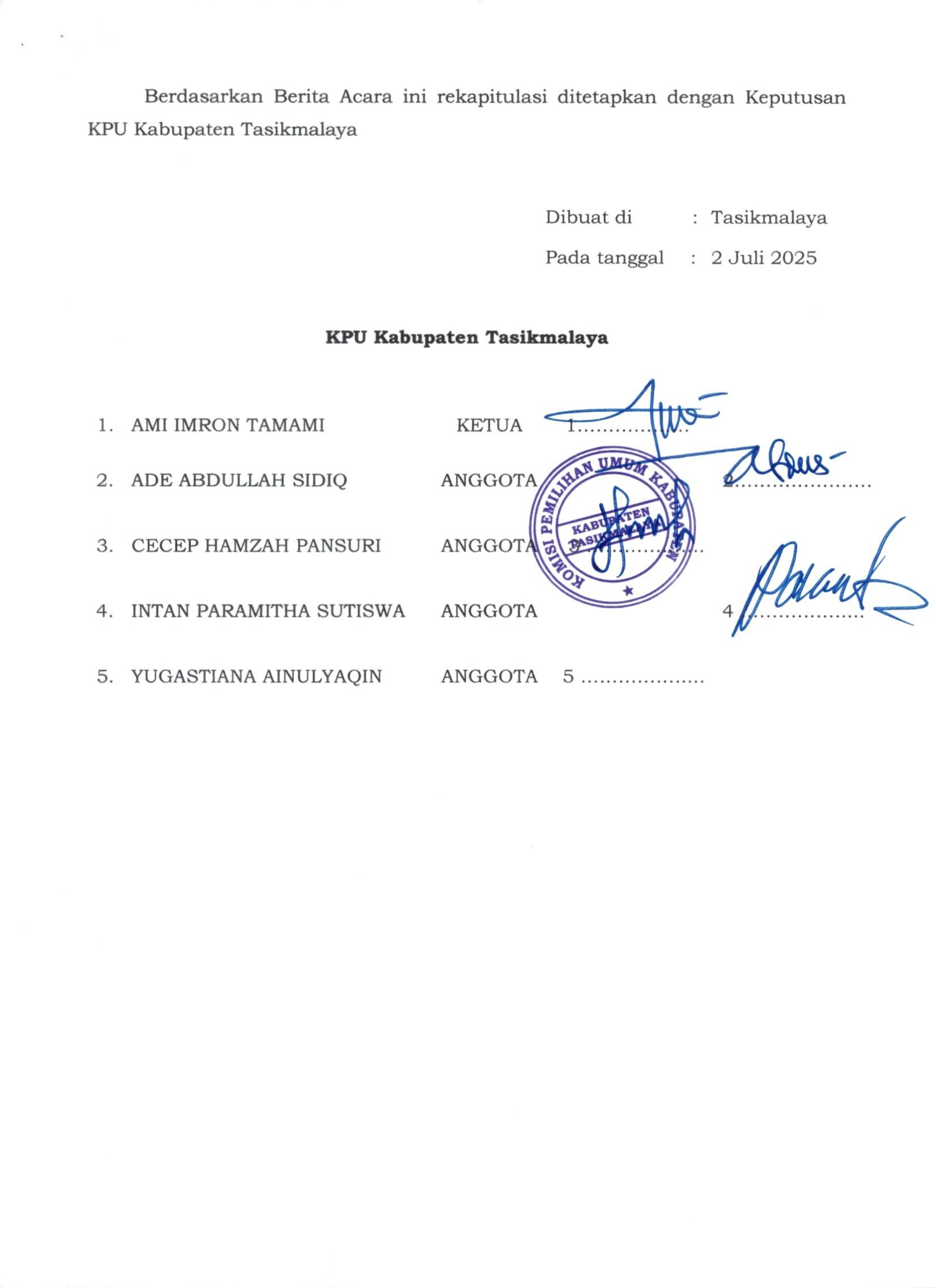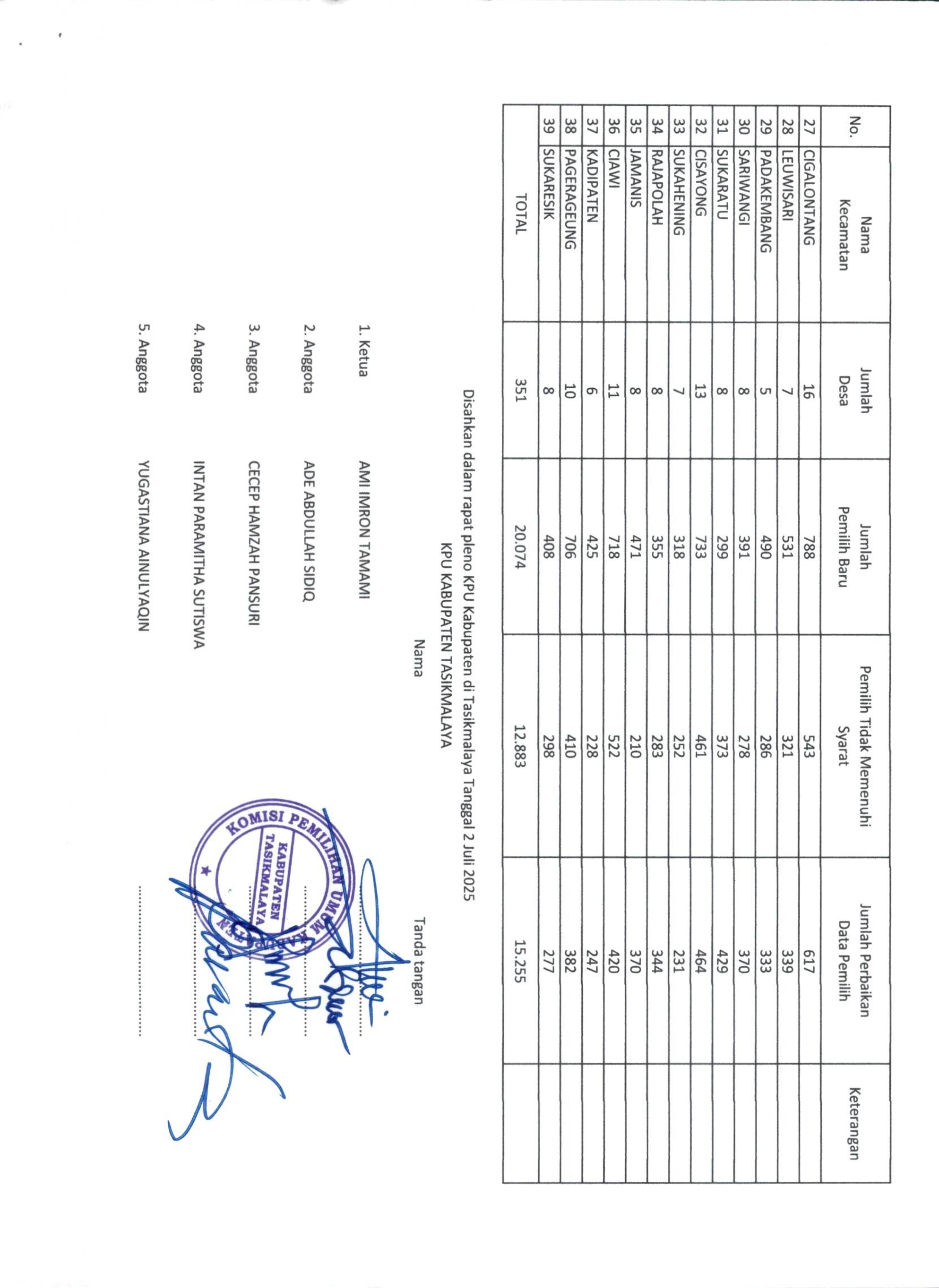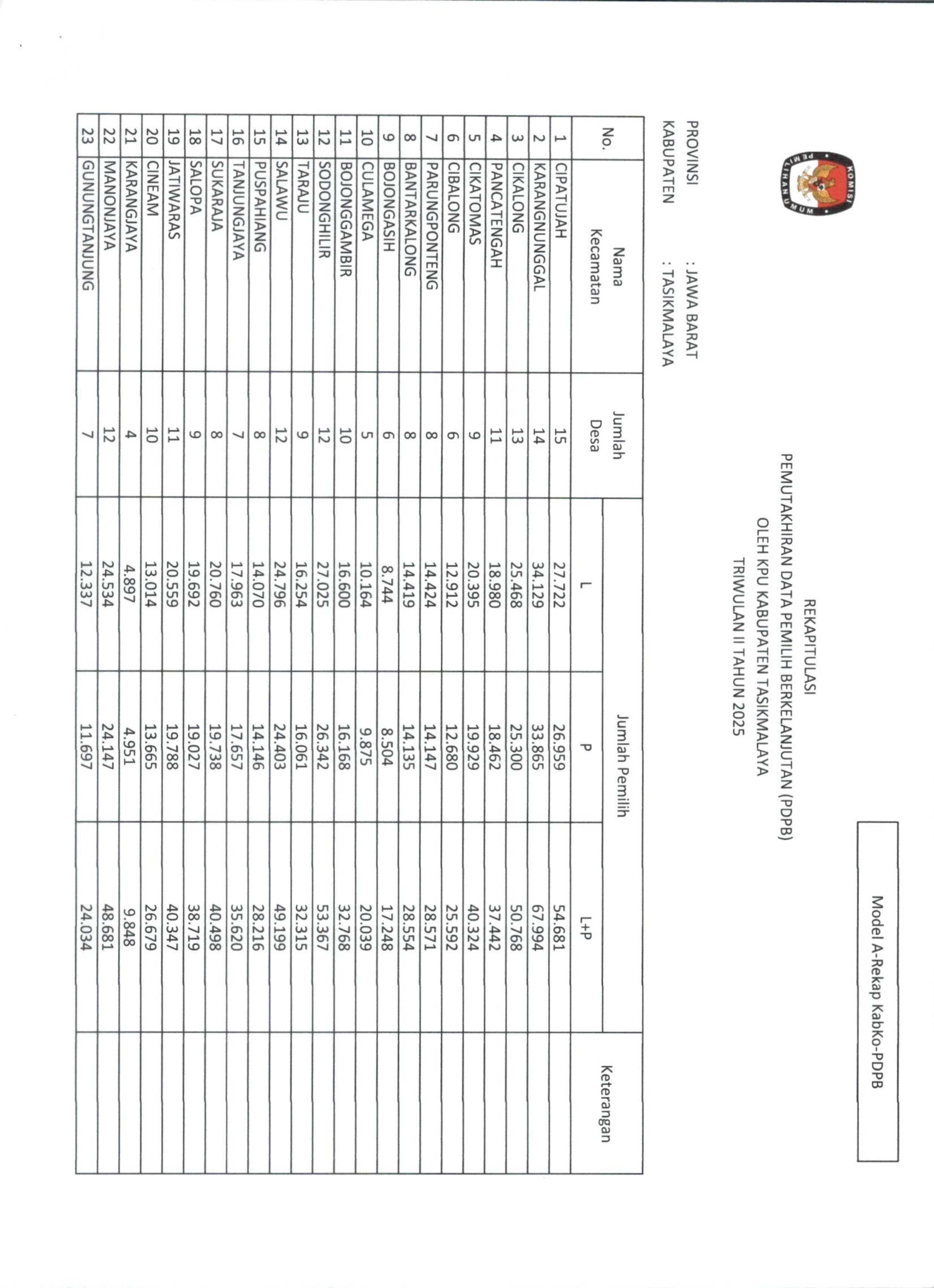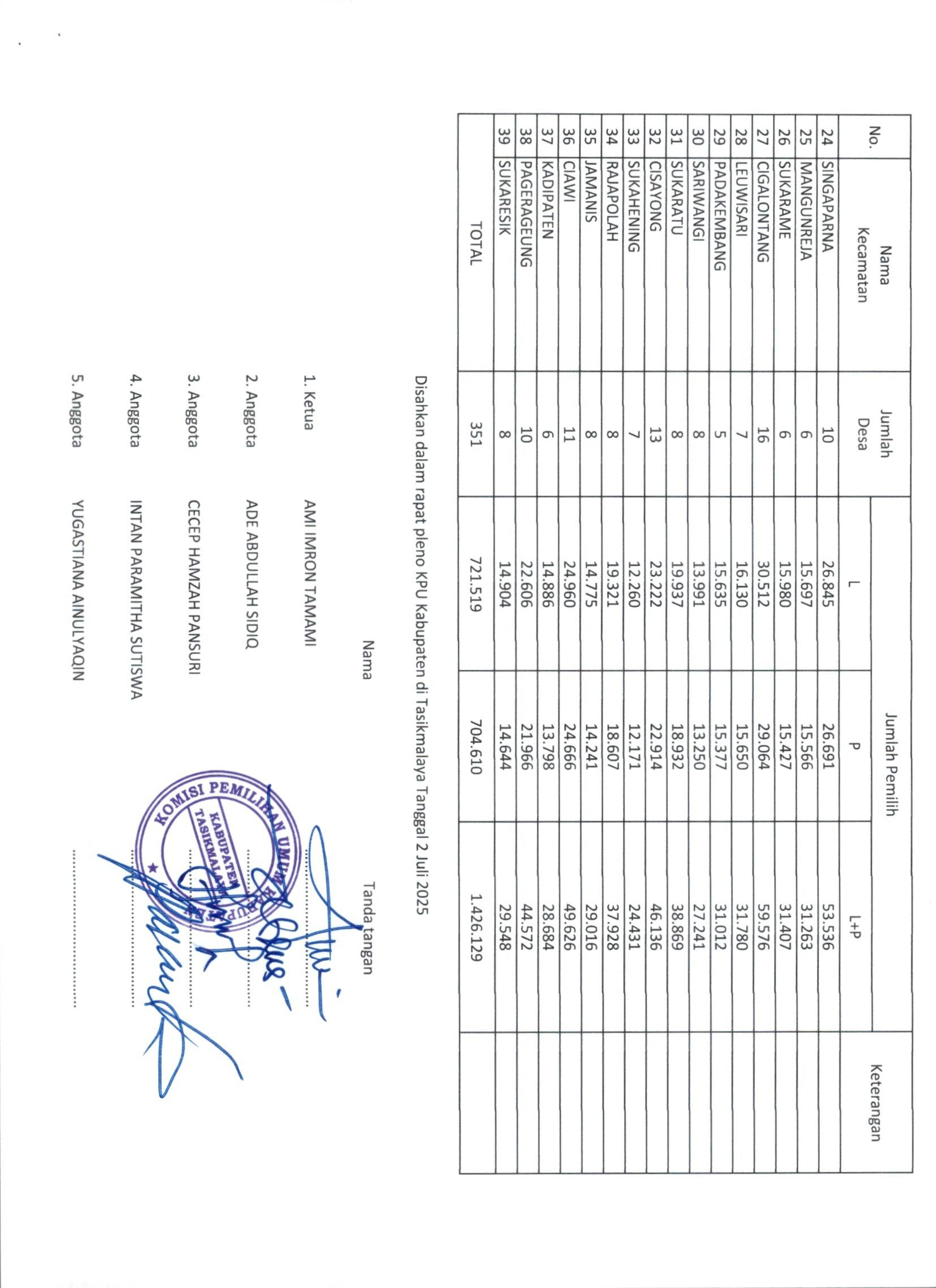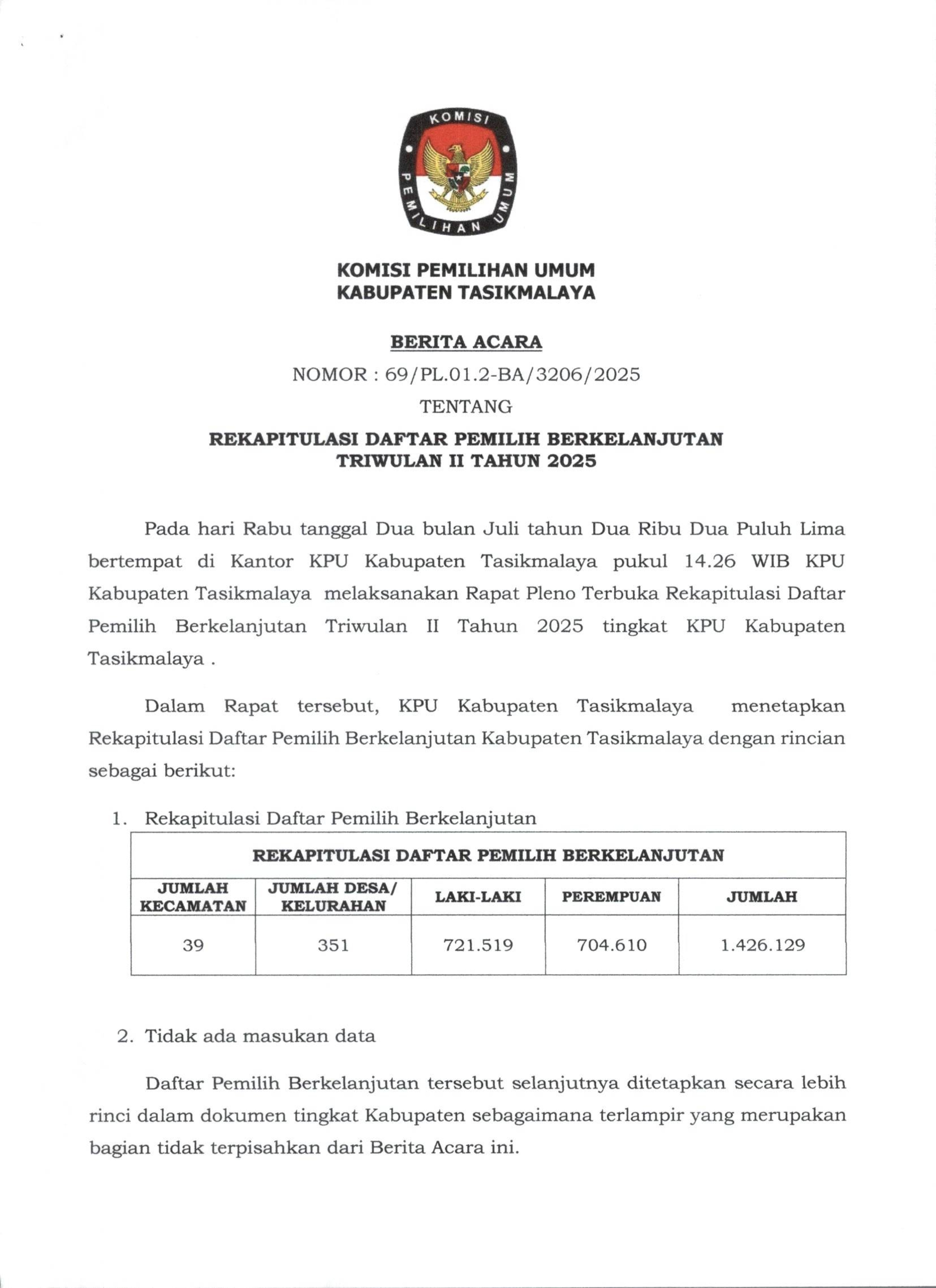 KPU Kabupaten Tasikmalaya menetapkan Daftar Pemilih Berkelanjutan (DPB) sebanyak 1.426.129 yang terdiri dari 721.519 pemilih laki-laki dan 704.610 pemilih perempuan melalui Rapat Pleno yang diselenggarakan di Aula Kantor KPU Kabupaten Tasikmalaya pada Rabu (02/07/2025). Rapat pleno dibuka secara langsung oleh Ketua KPU Kabupaten Tasikmalaya dengan didampingi oleh jajaran Anggota beserta Staff. Hadir juga Anggota Bawaslu Kabupaten Tasikmalaya yang turut mengikuti rapat pleno beserta tamu undangan lainnya.