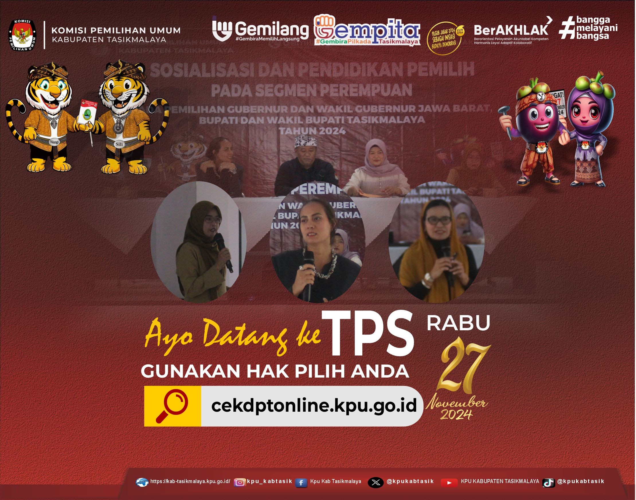 KPU Kabupaten Tasikmalaya mengadakan kegiatan Sosialisasi dan Pendidikan Pemilih pada segmen Perempuan. Acara bertempat di Gedung MUI Kabupaten Tasikmalaya. Acara berlangsung pada tanggal 16 Oktober 2024. Peserta kegiatan adalah ormas Perempuan yag ada di Kabupaten tasikmalaya. Narasumber kegiatan tersebut ialah Dr. Isti’anah, M.Ag membawa tema Pembangunan Politik dan Pilkada. Narasumber ke 2 Titik Nurhayati, M.Hum., MH membawa tema Pentingnya Partisipasi Masyarakat Jawa Barat untuk mensukseskan Pilkada 2024. Narasumber ke 3 Fiona Callagan, M.Si membawa tema Perempuan Cerdas Memilih.
