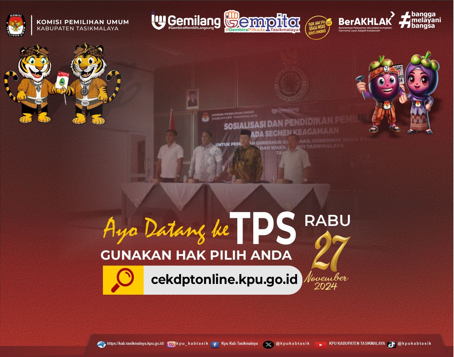 Pada hari rabu, 9 Oktober 2024 KPU Kabupaten Tasikmalaya mengadakan kegiatan Sosialisasi dan Pendidikan Pemilih Segmen Keagamaan bertempat di Gedung MUI Kabupaten Tasikmalaya. narasumber kegiatan tersebut dari Polreskab Tasikmalaya, MUI Kabupaten Tasikmalaya dan Bawaslu Kabupaten Tasikmalaya dengan peserta dari ormas – ormas keagamaan se Kab. Tasikmalaya.