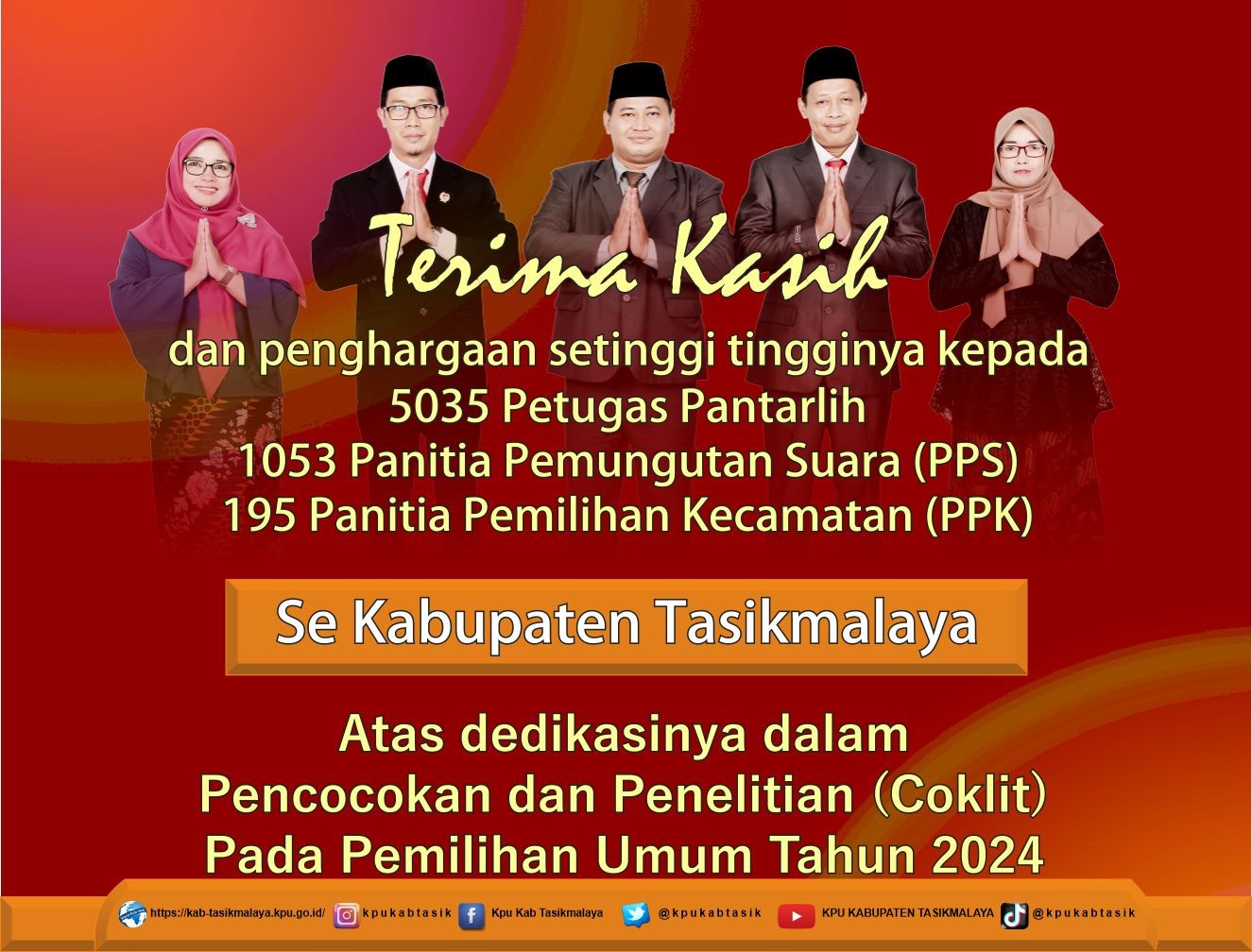 Atas nama KPU Kabupaten Tasikmalaya mengucapkan terimakasih yang sedalam-dalamnya atas kerja keras rekan-rekan tersebut. Semoga Tuhan Yang Maha Kuasa memberikan kekuatan kepada kita semua dan Pemilu 2024 di Indonesia berjalan aman dan lancar.