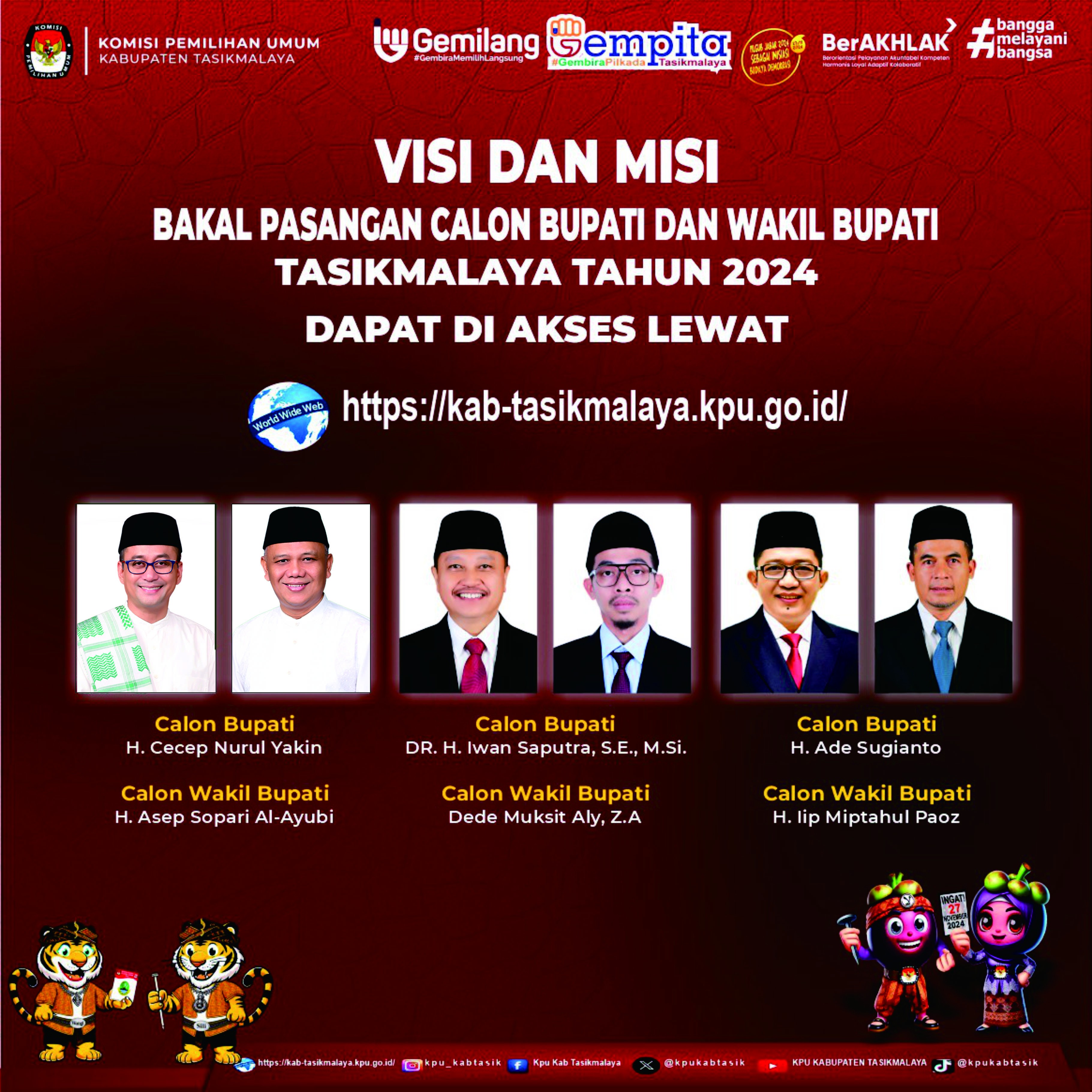 VISI DAN MISI BAKAL PASANGAN CALON BUPATI DAN WAKIL BUPATI TASIKMALAYA PADA PILKADA 2024 Sabtu, 14 September 2024 10:10 1866 VISI DAN MISI BAKAL PASANGAN CALON BUPATI DAN WAKIL BUPATI TASIKMALAYA 2024 H. CECEP NURUL YAKIN DR. H. IWAN SAPUTRA, S.E., M.Si. H. ADE SUGIANTO H. ASEP SOPARI AL-AYUBI DEDE MUKSIT ALY, Z.A H. IIP MIPTAHUL PAOZ VISI DAN MISI VISI DAN MISI VISI DAN MISI Bagikan: Dilihat 1,866 Kali.